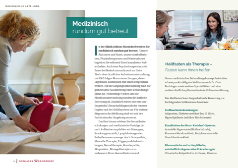 MEDIZINISCHE ABTEILUNGMedizinisch rundum gut betreutHeilfasten als Therapie %u2013 Fasten kann Ihnen helfenI n der Klinik Schloss Warnsdorf werden Sie medizinisch rundum gut betreut: Unsere %u00c4rztinnen und %u00c4rzte, unsere Arzthelferinnen, Physiotherapeuten und Masseurinnen begleiten Sie w%u00e4hrend Ihres kompletten Aufenthaltes. Auch eine Psychotherapeutin stehtIhnen bei Bedarf unterst%u00fctzend zur Seite. Nach einer %u00e4rztlichen Aufnahmeuntersuchungmit EKG folgen Blutuntersuchungen, derenErgebnisse ausf%u00fchrlich mit Ihnen besprochenwerden. Auf die Eingangsuntersuchung baut diegemeinsame Ausarbeitung eines Behandlungsplans auf. Notwendige Visiten und die Abschlussuntersuchung runden die %u00e4rztlicheBetreuung ab. Zus%u00e4tzlich bieten wir eine umfangreiche Ultraschalldiagnostik der innerenOrgane und des Gef%u00e4%u00dfsystems an. F%u00fcr weiterediagnostische Abkl%u00e4rung sind wir mit denFach%u00e4rzten der Umgebung vernetzt. Dar%u00fcber hinaus erleben Sie Gesundheitsschulungen und medizinische Vortr%u00e4ge. Je nach Indikation empfehlen wir Massagen,Krankengymnastik, Lymphdrainage oderFu%u00dfreflexzonenmassage. Auch Osteopathie,Manuelle Therapie, Triggerpunktbehandlungen, Neuraltherapie, Hom%u00f6opathie, Akupunktur, Blutegeltherapie u.v.m. verbessern Ihren Gesundheitszustand.Unser medizinisches Behandlungskonzept beinhaltetschwerpunktm%u00e4%u00dfig ein Heilfasten nach Dr. Otto Buchinger sowie weitere Spezialdi%u00e4ten und eine antientz%u00fcndliche pflanzenbasierte Vollwertern%u00e4hrung.Das Heilfasten kann langanhaltende Besserung u.a.bei folgenden Indikationen bewirken:Stofwechselerkrankungen:Adipositas, Diabetes mellitus Typ II, Gicht, Hyperlipid%u00e4mie (erh%u00f6hte Blutfettwerte) Krankheiten des Herz-Kreislauf-Systems:Arterielle Hypertonie (Bluthochdruck), Koronare Herzkrankheit, Periphere arterielle VerschlusskrankheitRheumatische und orthop%u00e4dische, entz%u00fcndlich-degenerative Erkrankungen:Chronische Polyarthritis, Arthrose, Rheuma10 SCHLOSS WARNSDORF