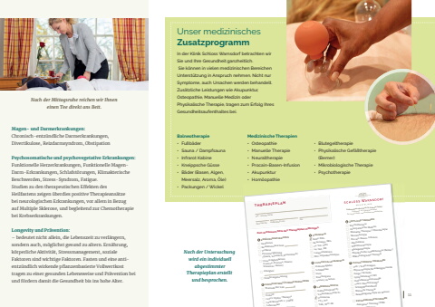 Nach der Mittagsruhe reichen wir Ihnen einen Tee direkt ans Bett.THERA PIEPLA NVor- und Zuname Zimmer-Nr. Aufenthalt von bisSchloss Warnsdorf Klinik Dr. Scheele GmbHSchlossstr. 10, 23626 Warnsdorf Tel. 04502%u20138400, www.schloss-warnsdorf.deZum Arztbesuch bitte den Therapieplan mitbringen.1 ERN%u00c4HRUNGSTHERAPIEN%uf063 Heilfasten%uf063 Reduktionskost kcal %uf063 Vollkost %uf063 Proteinerg%u00e4nzung (Quark, Sojamilch, Buttermilch) %uf063 Unvertr%u00e4glichkeiten (Lactose, Fructose, Kasein, Histamin, Gluten) %uf063 Allergien:%uf063 Ern%u00e4hrungsberatung 2 FASTENUNTERST%u00dcTZENDE MA%u00dfNAHMEN%uf063 Warnsdorfer Salz g %uf063 %uf063 Einlauf%uf063 Colon-Hydro-Therapie%uf063 Sauerkrautsaft 2-3 t%u00e4gig %uf063 Leberwickel assagen 8 %u00c4RZTLICHE THERAPIEN%uf063 Psychotherapie%uf063 Osteopathische Medizin %uf063 Manuelle Therapie / Chirotherapie%uf063 Neuraltherapie%uf063 Procain-Basen-Infusion %uf063 Akupunktur %uf063 Eigenbluttherapie%uf063 Blutegeltherapie%uf063 Physikalische Gef%u00e4%u00dftherapie (Bemer)%uf063 Mikrobiologische Therapie 9 PHYSIOTHERAPIE/MASSAGEN%uf063 Voll-/ Teilmassagen %uf063 Physiotherapie/Krankengymnastik %uf063 Fango / Rotlicht %uf063 Lymphdrainage / IKT %uf063 Fu%u00dfrefl exzonenmassage%uf063 Colon-Bauchmassage%uf063 Schr%u00f6pfbehandlung %uf063 Manuelle Therapie%uf063 Bewegungstherapie im Wasser %uf063 ENTSPANNUNGSTECHNIKEN Autogenes Training / PMR/Meditation 5 DIAGNOSTIK%uf063 Ruhe-EKG %uf063 Belastungs-EKG %uf063 24-Std.-EKG %uf063 24-Std.-RR %uf063 Lungenfunktion %uf063 BIO-Impedanzanalyse 6 ULTRASCHALLDIAGNOSTIK%uf063 Halsschlagader %uf063 Schilddr%u00fcse%uf063 Herz %uf063 Bauchorgane%uf063 Venen / Arterien 7 LABORDIAGNOSTIK%uf063 Aufnahmeprofi l P3%uf063 Verlaufskontrolle P1%uf063 Urinstatus%uf063 fT3, fT4%uf063 TAK, TPO-AK A1XXMagen- und Darmerkrankungen: Chronisch-entz%u00fcndliche Darmerkrankungen, Divertikulose, Reizdarmsyndrom, ObstipationPsychosomatische und psychovegetative Erkrankungen:Funktionelle Herzerkrankungen, Funktionelle MagenDarm-Erkrankungen, Schlafst%u00f6rungen, KlimakterischeBeschwerden, Stress-Syndrom, Fatigue.Studien zu den therapeutischen Efekten des Heilfastens zeigen %u00fcberdies positive Therapieans%u00e4tze bei neurologischen Erkrankungen, vor allem in Bezug auf Multiple Sklerose, und begleitend zur Chemotherapiebei Krebserkrankungen. Longevity und Pr%u00e4vention:%u2013 bedeutet nicht allein, die Lebenszeit zu verl%u00e4ngern,sondern auch, m%u00f6glichst gesund zu altern. Ern%u00e4hrung,k%u00f6rperliche Aktivit%u00e4t, Stressmanagement, soziale Faktoren sind wichtige Faktoren. Fasten und eine antientz%u00fcndlich wirkende pflanzenbasierte Vollwertkost tragen zu einer gesunden Lebensweise und Pr%u00e4vention beiund f%u00f6rdern damit die Gesundheit bis ins hohe Alter. In der Klinik Schloss Warnsdorf betrachten wir Sie und Ihre Gesundheit ganzheitlich. Sie k%u00f6nnen in vielen medizinischen BereichenUnterst%u00fctzung in Anspruch nehmen. Nicht nurSymptome, auch Ursachen werden behandelt. Zus%u00e4tzliche Leistungen wie Akupunktur, Osteopathie, Manuelle Medizin oder Physikalische Therapie, tragen zum Erfolg Ihres Gesundheitsaufenthaltes bei.Balneotherapie%u2022 Fu%u00dfb%u00e4der %u2022 Sauna / Dampfsauna %u2022 Infrarot Kabine %u2022 Kneippsche G%u00fcsse %u2022 B%u00e4der (Basen, Algen, Meersalz, Aroma, %u00d6le) %u2022 Packungen / WickelMedizinische Therapien %u2022 Osteopathie %u2022 Manuelle Therapie %u2022 Neuraltherapie %u2022 Procain-Basen-Infusion %u2022 Akupunktur %u2022 Hom%u00f6opathie%u2022 Blutegeltherapie %u2022 Physikalische Gef%u00e4%u00dftherapie (Bemer) %u2022 Mikrobiologische Therapie %u2022 PsychotherapieUnser medizinisches ZusatzprogrammNach der Untersuchung wird ein individuell abgestimmter Therapieplan erstellt und besprochen. 11
