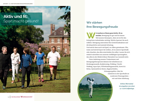 Schloss Warnsdorf ist umgeben von einer 27-Loch Golfanlage.SPORT- & ENTSPANNUNGSPROGRAMMAktiv%u0009und%u0009fi%u0009t:Sport macht gesund!W ir machen es Ihnen ganz leicht, fit zu werden. Bewegung tut gut und ist immer Teil unseres Konzeptes, denn sie ist f%u00fcr den Erfolg Ihres Aufenthaltes wichtig. Welche Sportart Sie auchw%u00e4hlen: Bewegung unterst%u00fctzt Ihre Gewichtsabnahme unddie k%u00f6rperliche und mentale Erholung. Und macht dazu noch viel Spa%u00df, vor allem gemeinsam. Wie,wann und wieviel Sport Sie treiben, ob in unserer Sporthalleoder drau%u00dfen, das alles entscheiden Sie selbst. Lassen Sie sicheinfach mitrei%u00dfen von unserem vielf%u00e4ltigen Sportangebot,das allen in der Klinik Schloss Warnsdorf zur Auswahl steht. Unter Anleitung unserer Trainerinnen und Bewegungstherapeuten k%u00f6nnen Sie teilnehmen an: R%u00fcckengymnastik, Bodyforming, Walking / Nordic Walking, Aqua Gym, Wirbels%u00e4ulengymnastik, Stretch & Relax, Gymnastik im Sitzen, Bogenschie%u00dfen, Schnuppergolfen. Oder Sietrainieren in der Sporthalle anmodernen Fitnessger%u00e4ten -mit und ohne Anleitung. Wir st%u00e4rkenIhre Bewegungsfreude14 SCHLOSS WARNSDORF