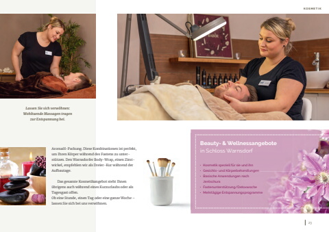 KOSMETIKLassen Sie sich verw%u00f6hnen: Wohltuende Massagen tragen zur Entspannung bei. Beauty- & Wellnessangebotein Schloss Warnsdorf Aroma%u00f6l-Packung. Diese Kombinationen ist perfekt,um Ihren K%u00f6rper w%u00e4hrend des Fastens zu unterst%u00fctzen. Den Warnsdorfer Body-Wrap, einen Zimtwickel, empfehlen wir als Dreier-Kur w%u00e4hrend derAufbautage. Das gesamte Kosmetikangebot steht Ihnen %u00fcbrigens auch w%u00e4hrend eines Kurzurlaubs oder als Tagesgast ofen. Ob eine Stunde, einen Tag oder eine ganze Woche %u2013lassen Sie sich bei uns verw%u00f6hnen. %u2022 Kosmetik speziell f%u00fcr sie und ihn%u2022 Gesichts- und K%u00f6rperbehandlungen%u2022 Basische Anwendungen nach Jentschura%u2022 Fastenunterst%u00fctzung/Detoxwoche%u2022 Mehrt%u00e4gige Entspannungsprogramme23