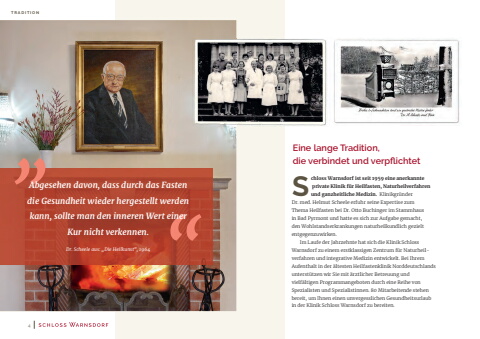 4%u201c Eine lange Tradition,die verbindet und verpfl ichtetSTRADITION%u201e%u201cAbgesehen davon, dass durch das Fasten die Gesundheit wieder hergestellt werden kann, sollte man den inneren Wert einer Kur nicht verkennen.Dr. Scheele aus: %u201eDie Heilkunst%u201c, 1964 chloss Warnsdorf ist seit 1959 eine anerkannte private Klinik f%u00fcr Heilfasten, Naturheilverfahren und ganzheitliche Medizin. Klinikgr%u00fcnder Dr. med. Helmut Scheele erfuhr seine Expertise zum Thema Heilfasten bei Dr. Otto Buchinger im Stammhausin Bad Pyrmont und hatte es sich zur Aufgabe gemacht, den Wohlstandserkrankungen naturheilkundlich gezieltentgegenzuwirken. Im Laufe der Jahrzehnte hat sich die Klinik SchlossWarnsdorf zu einem erstklassigen Zentrum f%u00fcr Naturheilverfahren und integrative Medizin entwickelt. Bei Ihrem Aufenthalt in der %u00e4ltesten Heilfastenklinik Norddeutschlands unterst%u00fctzen wir Sie mit %u00e4rztlicher Betreuung und vielf%u00e4ltigen Programmangeboten durch eine Reihe von Spezialisten und Spezialistinnen. 80 Mitarbeitende stehenbereit, um Ihnen einen unvergesslichen Gesundheitsurlaub in der Klinik Schloss Warnsdorf zu bereiten.